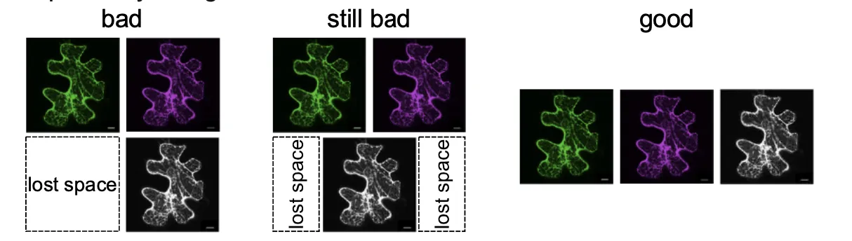 图片中的颜色应当差异明显且视觉效果良好。期刊都会要求考虑到色觉障碍人士,因而要求避免使用诸如红色与绿色这样的颜色组合作为对比(改为使用洋红色与绿色),尤其是在荧光显微照片中。