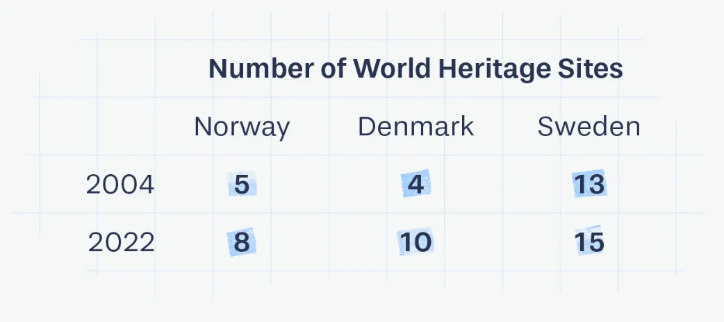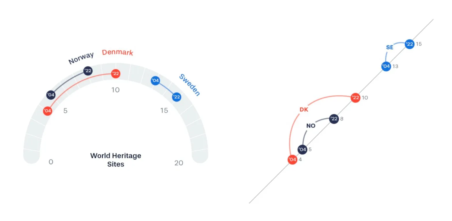 - 可以体现出跨越性的增长与压倒性的优势:丹麦(橙色)的世界遗产数量从04年的不如挪威(深蓝色),到22年超越挪威,这种跨越性的增长趋势在这两张图中一目了然,反观上面的几个柱状图,都需要在柱子长度间反复多次比较数值,才能观察到这种变化;另一方面,瑞典(蓝色)无论哪个年度的数量都远超另外两个人国家,这个结论在前面的图中也能通过比较得出,但在这张图中尤其清晰。 究其原因,这两张图将本身分散的长度、位置信息合并在了同一条线上,使得相互间的比较更为容易。但它也有一些缺点: