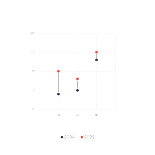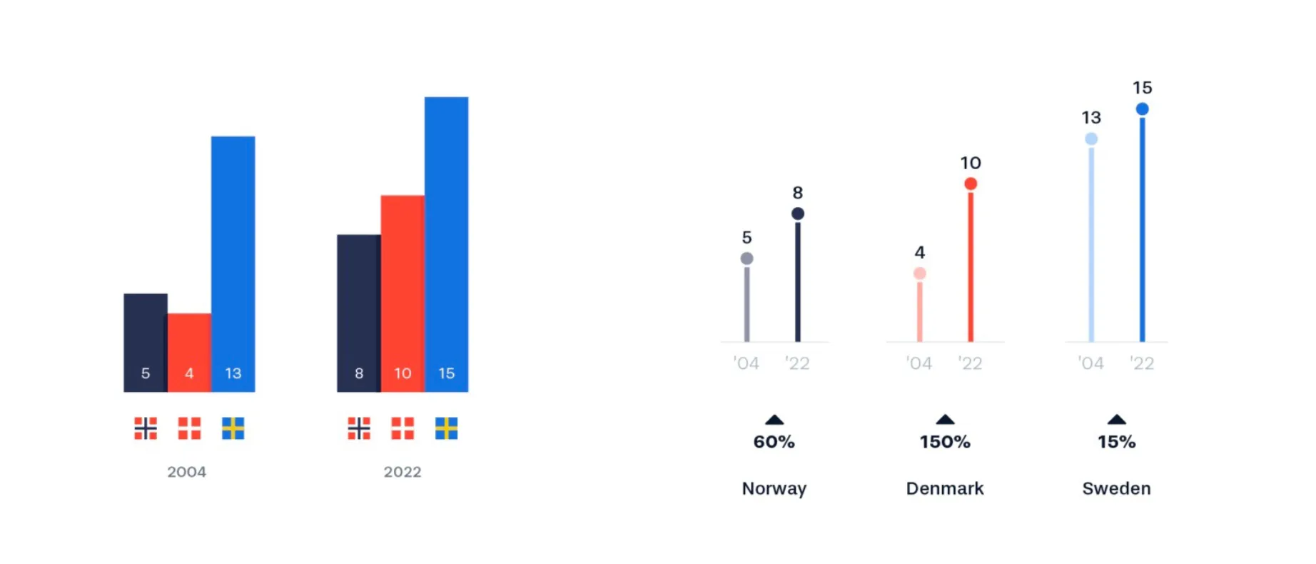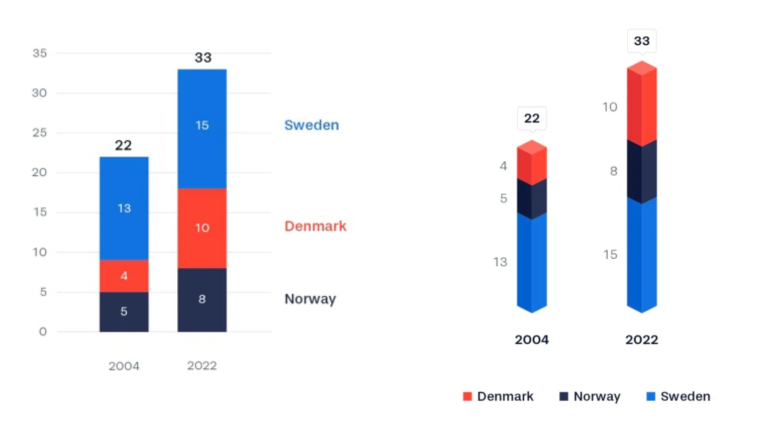 同样,假如不放在一条直线上,而是按位置分开的图也有,比如下面这张图。上面提到的一些优点,比如增长幅度的大小、丹麦超越性的增长、瑞典压倒性的数量也都可以看到,但少了在原位的国家名称与数量标注,感觉就没那么醒目了。但这张图也有它的优点:使用颜色来表示年份而不是国家,假如有国家的数量下降了,在这张图上就会很好地展现出来。