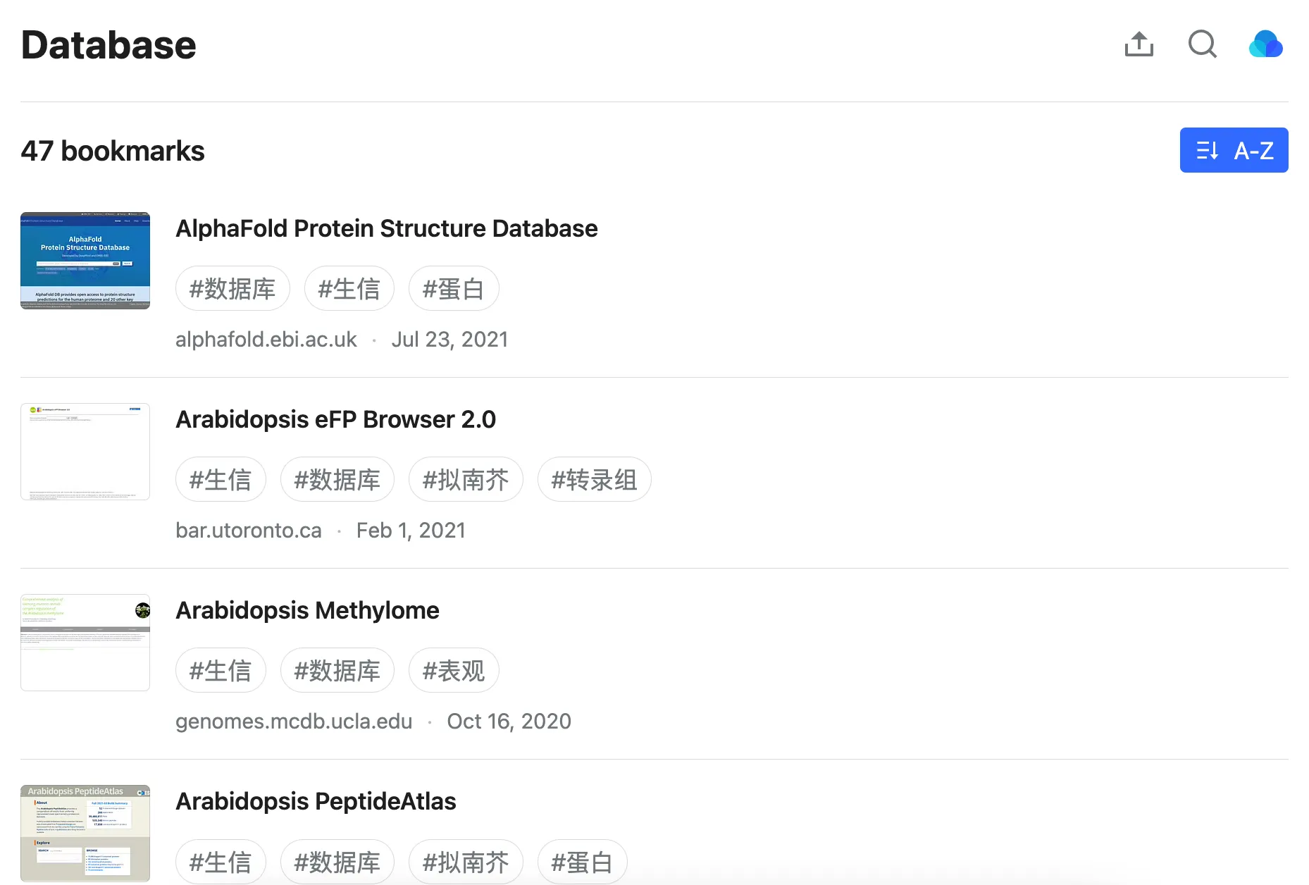 文件夹组成的是一种树状结构,然而每个数据库的属性并不是整齐的树状。比如一个数据库,即可以带有「拟南芥」的属性,表明它主要是一个拟南芥的数据库,同时它还可能带有一个「蛋白」的属性,表明其是蛋白质结构、或是蛋白修饰的数据库,因此这样的数据库并不能单一地根据物种或是数据类型进行分类。
