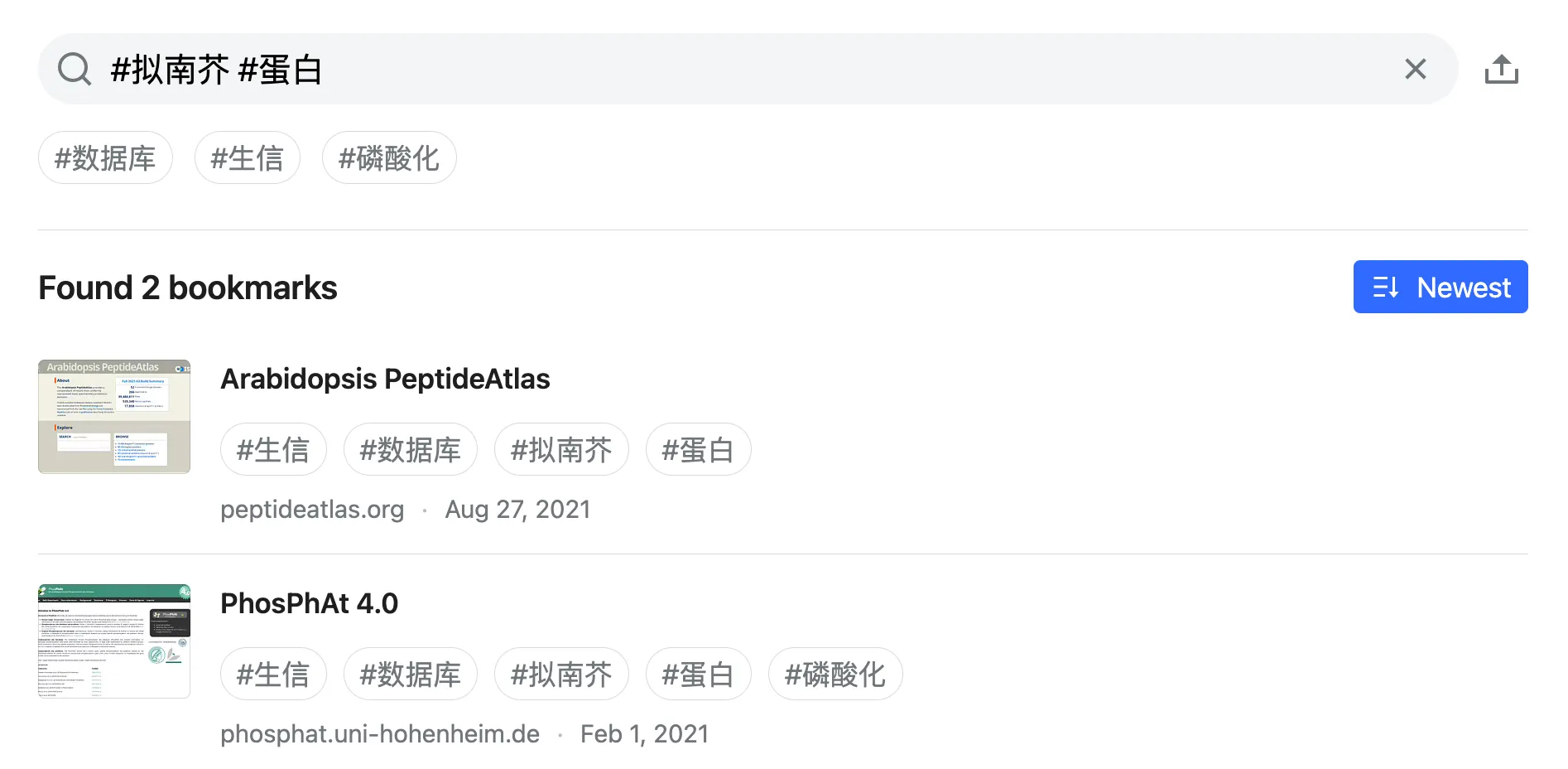 举个例子,假如想寻找和拟南芥蛋白有关的数据库,则可以在下面的标签中依次点击「#拟南芥」和「#蛋白」,也可以直接在搜索框中输入这两个标签。