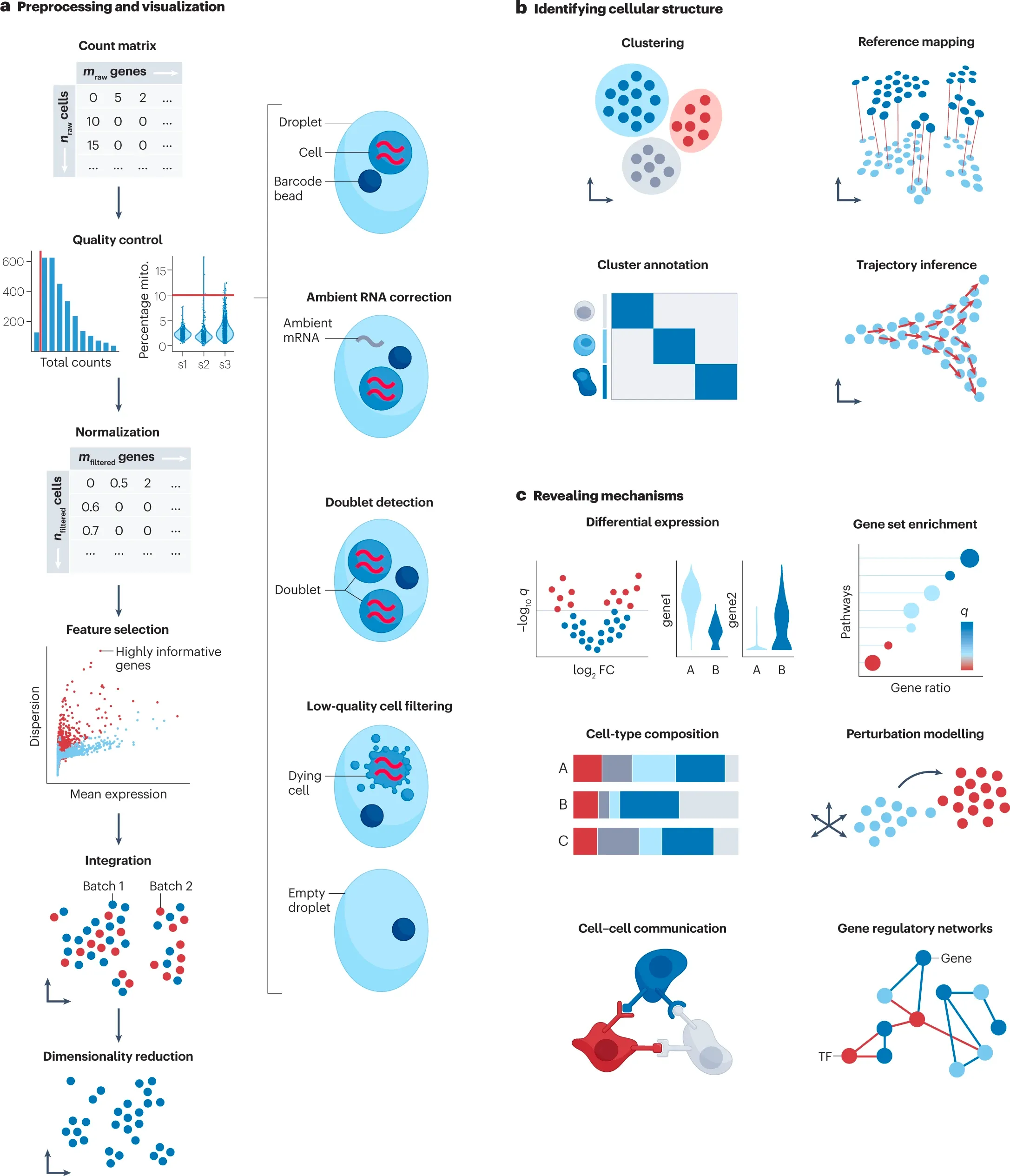 跨模式单细胞分析的最佳实践,于 2023 年 3 月 31 日发表于 nature reviews genetics。最近在研究单细胞分析相关的资料,因此记下这篇笔记。文章中包含了 Transcriptome、Chromatin accessibility、Surface protein expression、空间转录组等多个方面,但就近期关注点而言,只精简记录单细胞转录组部分的笔记。如果有需要,可以阅读原文。